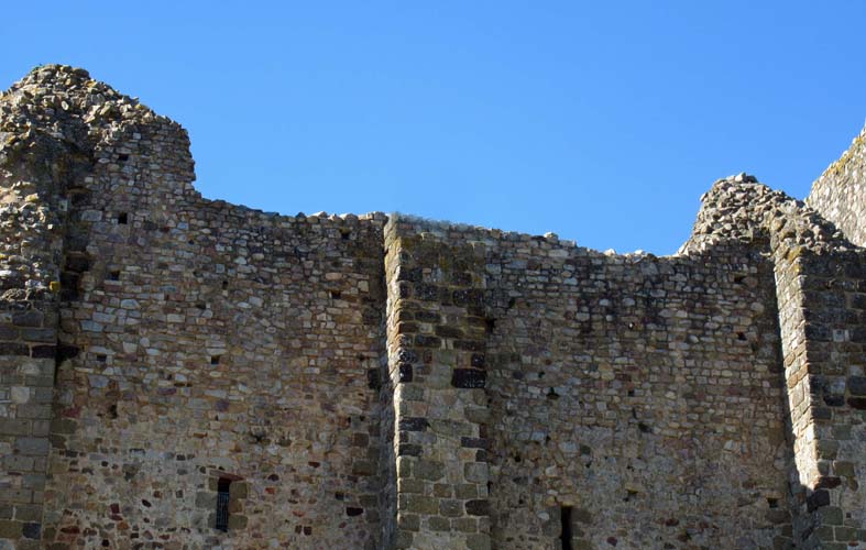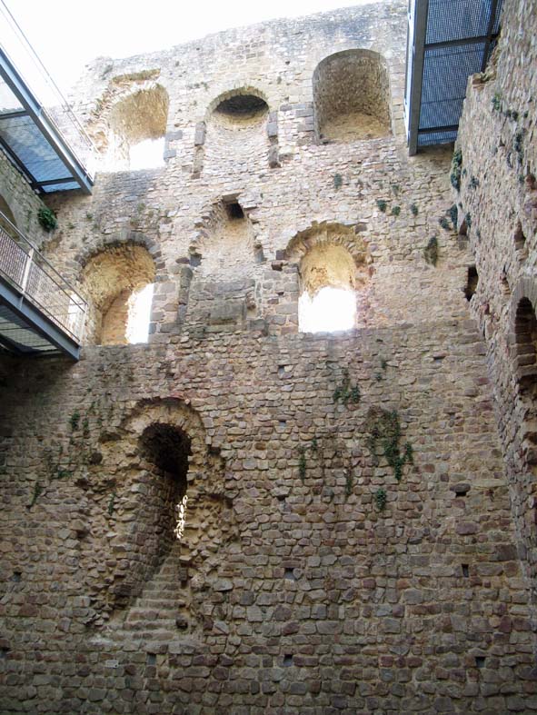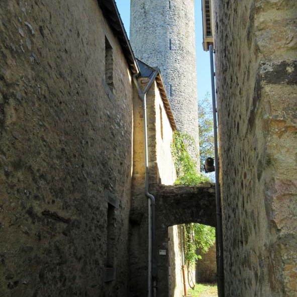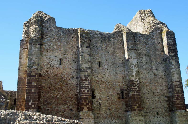 Le donjon de style roman du 11ème siècle est l’élément le plus ancien. De taille imposante, ( 19,45 m de long, 15,5 m de large, pour une hauteur maximale de 19 m et des murs de 3 m d’épaisseur.), il s’élève sur trois niveaux: cellier en bas, étage de réception, le dernier niveau étant réservé aux fonctions privatives. Son niveau de confort pour l’époque est impressionnant: latrines, cheminées, « lavabos » creusés dans l’épaisseur des murs en témoignent.