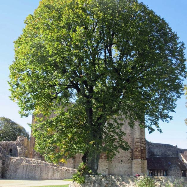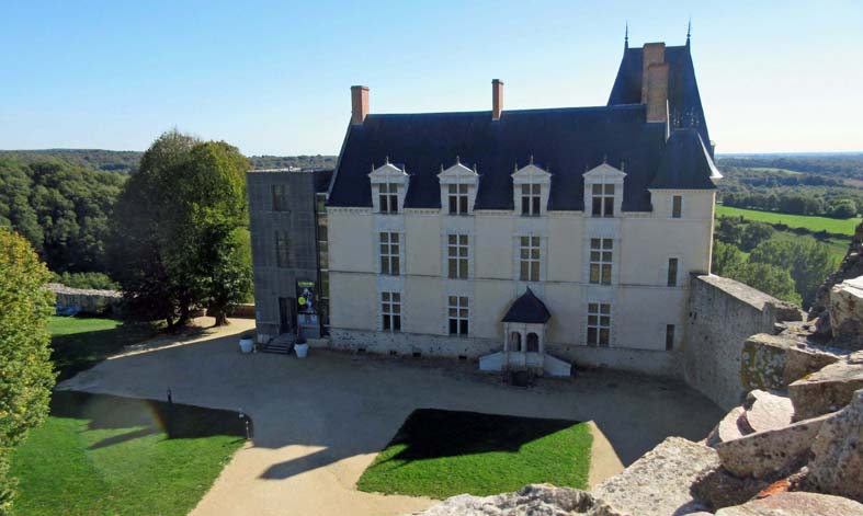 On est frappé par l’immensité du lieu. Ancienne boulangerie sur la gauche donc en entrant, ancienne bergerie en face. Immédiatement sur la droite en entrant, le donjon. Dominant la Forêt de Charnie le Logis du 17 ème siècle. Des arbres centenaires semblent veiller sur le site.