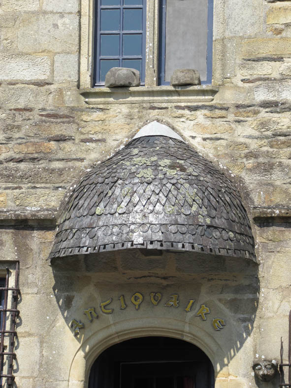 La boutique d’un antiquaire, à laquelle on accède par un escalier de pierre, se pare d’une jolie marquise en écailles d’ardoises.