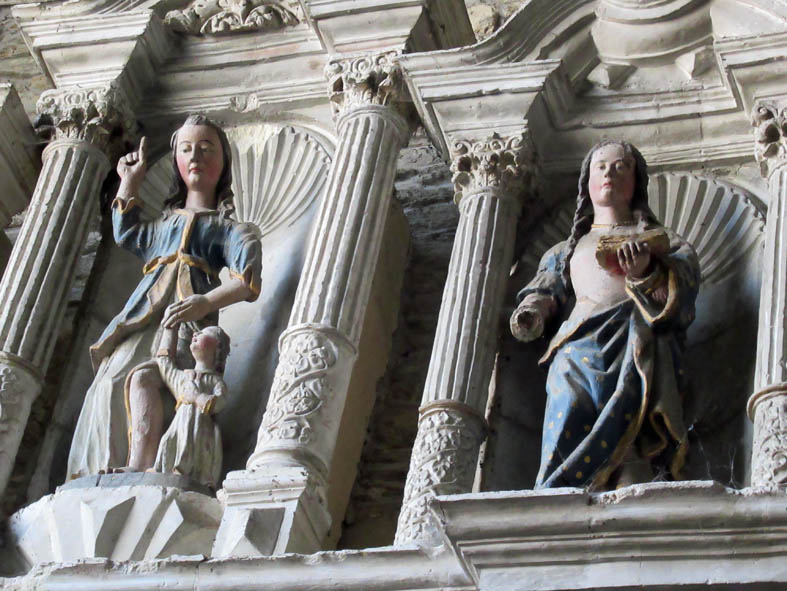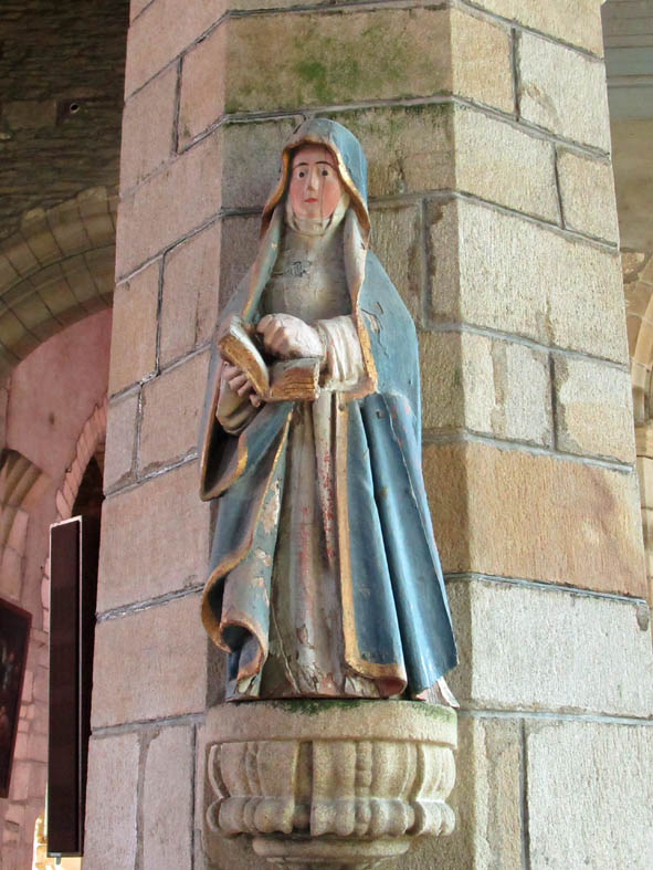 A l’opposé, on peut noter la sobriété de la chaire à prêcher et quelques statues polychromes ici celles de Saint Mathurin et de Françoise d’Amboise, Duchesse de Bretagne par son mari. (Devenue veuve, elle fait le vœu dans l’église de la Tronchaye de ne plus jamais se marier et finira au Carmel.)