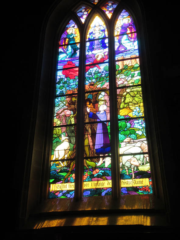 Le vitrail du chœur, qui représente la Sainte Famille (1926) et le vitrail de la Bergère découvrant la statue de la Vierge dans le tronc d’arbre (1927) sont l’œuvre d’un artisan verrier d’Angers.