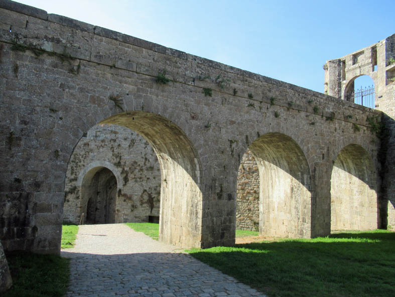 A l’intérieur de la cour, on ne peut pas manquer les piliers tout aussi imposants et massifs du pont qui mène au donjon.
